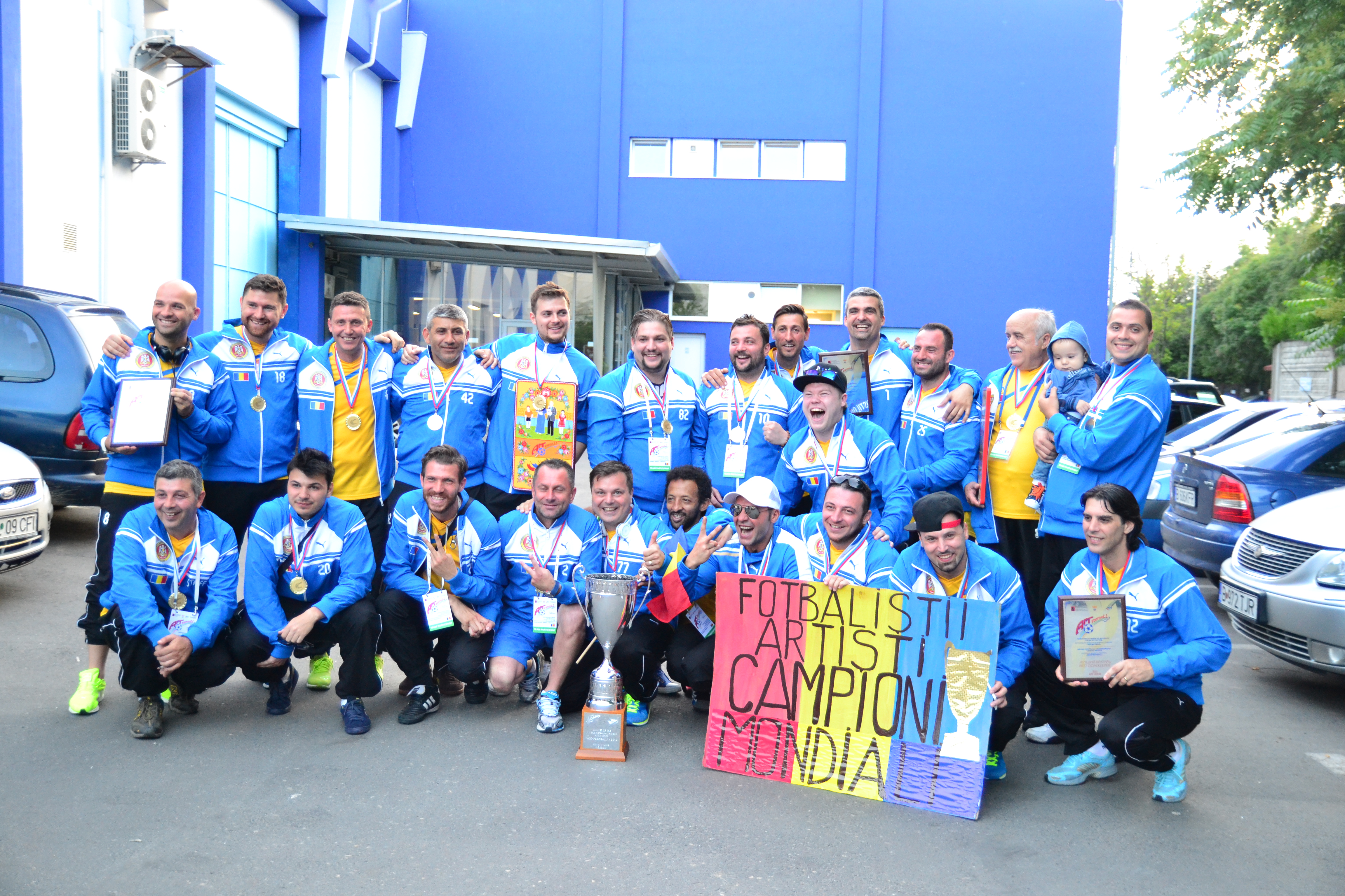 Dupa ani si ani de munca, daruie si antrenamente anul acesta Nationala Artistilor Fotblisti din Romania a reusit sa castige titul suprem: CAMPIONA MONDIALA A ARTISTILOR. La a 4-a editie ART FOOTBALL desfasurata la Moscova in perioada 23 mai – 2 iunie 2014, au participat 16 echipe: Romania, Israel, Romania, Rusia, Olanda, Correa de Sud, Italia, Slovacia, Slovenia, Brazilia, Germania, Japonia, Estonia, Iran, Kazakstan si Anglia. Romania a fost repartizata in grupa C unde a trecut cu 5-3 de Slovacia, 7-1 cu Coreea de Sud si 7-1 cu Italia. In semi finale a invins Brazilia, detinatoarea trofeului cu scorul de 2-1 si apoi in finala a trecut de Israel cu 4-3 la lovituri de departajare, dupa 0-0 in timpul meciului. Pe langa locul 1 la fotbal, echipa noastra a castigat mai multe premii atat la fotbal cat si la festivalul muzical: locul 3 – cel mai bun show muzical, locul 3 cea mai buna voce- Aurelian Temisan, locul 2 cea mai buna voce – Andi Grasu, cel mai bun portar – Adi Robu si cel mai bun mijlocas al turneului – Andrei Stefanescu.